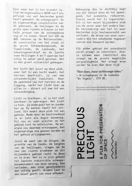 Dat de NDSM-werf verandert vindt Min niet erg. Het leven is in beweging, en verandering moet je niet stop willen zetten. Als alles maar met respect voor de omgeving en geschiedenis gebeurt. Het DoubleTree hotel bijvoorbeeld, dat vindt ze best mooi gemaakt. En de vele festivals storen haar ook niet. Die worden opgebouwd en afgebroken, en daarna is de werf weer gewoon zichzelf. Het kan het hebben. Ze hoopt alleen dat het niet te netjes wordt. Het moet een beetje ongedefinieerd blijven. En koester het licht. De oevers vol bouwen, zodat de werf in de schaduw komt te liggen, zou ze eeuwig zonde vinden. Mensen noemen de parken wel eens de longen van de stad. Min ziet het beton van de NDSM als de longen van de stad.